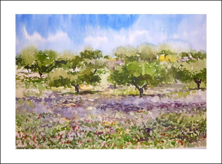 Un cuadro de un paisaje de dehesa propio de Extremadura que he pintado en acuarela con tonos violetas en la zona de la vegetación, Flores que adornan este bonito paisaje extremeño en mitad de las encinas.