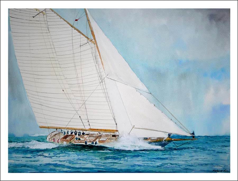 Una goleta de estilo clásico con todo su aparejo desplegado surca el mar penetrándo en el océano debido a la velocidad que hay por el viento. Este tipo de cuadros en los que los barcos se someten a situaciones extremas de navegación siempre me han atraído sobre todo por el hecho de poder pintar el mar y esos veleros con todas sus velas desplegadas es siempre un motivo fascinante para pintar. En este caso en el cuadro que presento el aire también es otro elemento principal del cuadro y unas nubes difusascon un cielo que se presenta algo claro pero con unas nubes grises que se difuminan hacia abajo amenazando borrasca.