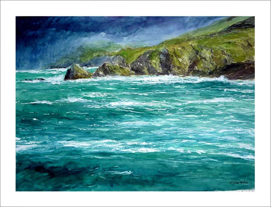 En esta zona de la costa de Lugo tan deseada por los surfistas se puede sentir el océano Atlántico en estado puro ya que muchos de los temporales que entran en España lo hacen por esta zona de acantilados. En esta acuarela he querido pintar los acantilados tan espectaculares que hay a lo largo de este tramo de costa gallega. Cuando el cielo está tan nublado que es de color amoratado se puede ver cómo el color del agua cambia apareciendo tonalidades verdosas mezcladas con las azules.