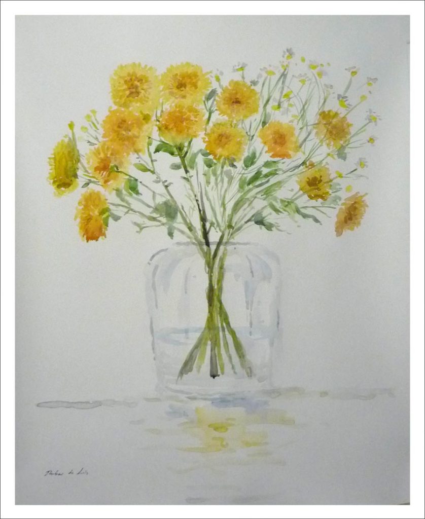 En esta caso y como en la ocasión anterior he pintado estas flores que destacan por las tonalidades de amarillo en su gama junto a los verdes de los tallos que se transparentan en el florero.