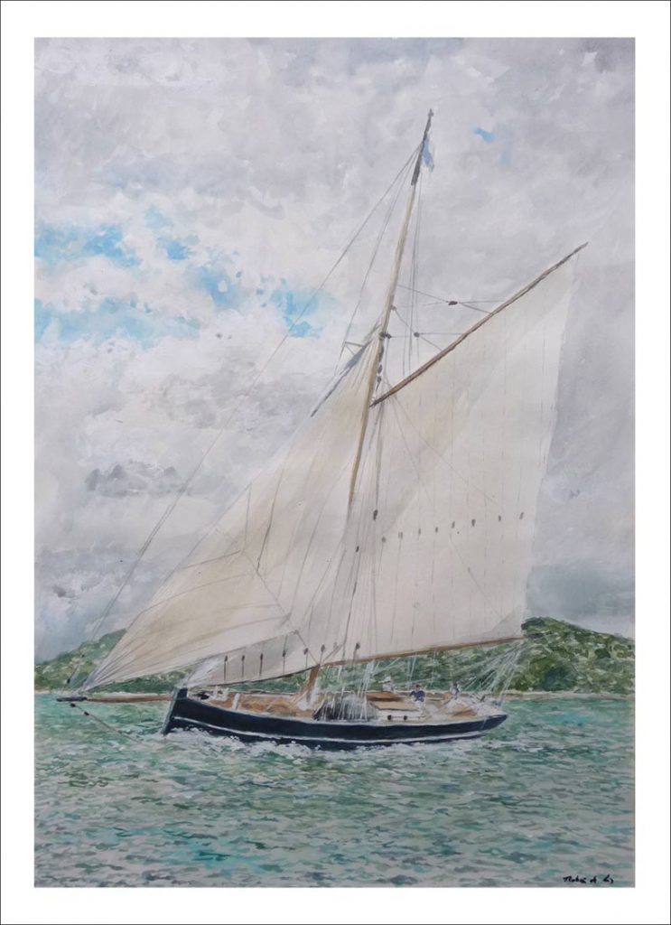 Dejando una franja más estrecha para la parte inferior. El mástil acompaña al cielo apuntando hacia arriba y dejando ver los aparejos y todo el velamen desplegado de tonos algo amarillentos quizás por la luz y el uso.