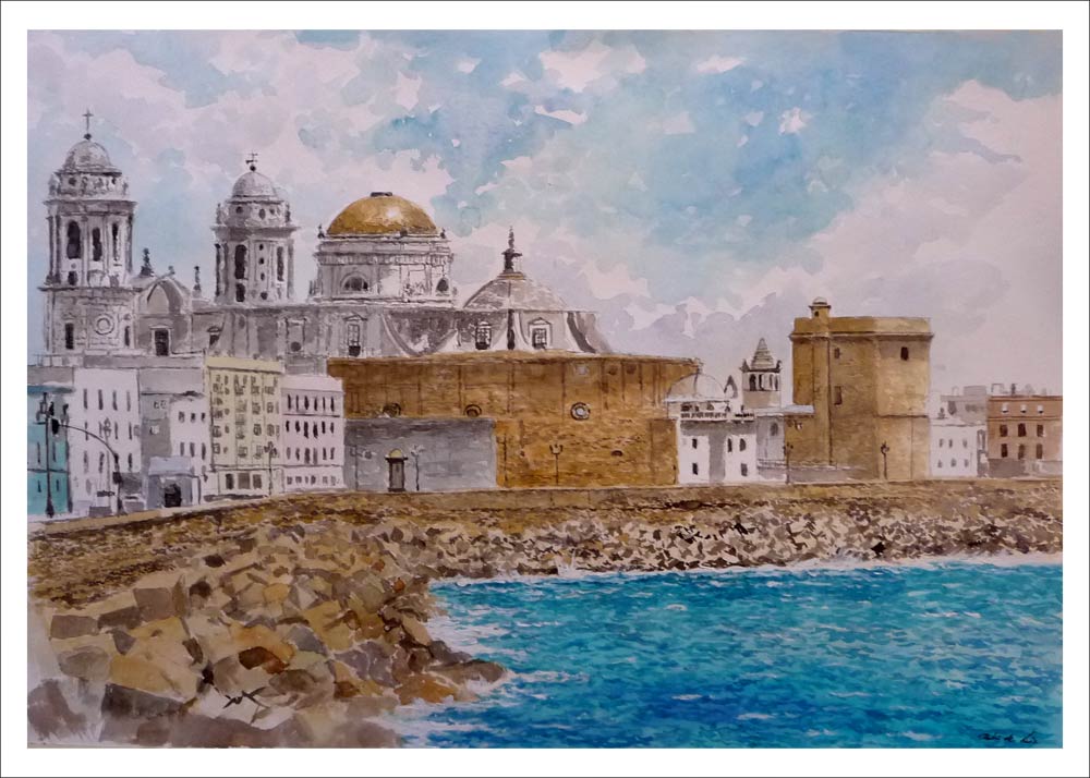 Presento aquí un cuadro en acuarela de Cádiz en el que se aprecia como protagonista la catedral junto al paseo y el mar en el margen derecho del cuadro. Una acuarela de la serie de cuadros en acuarelas de Andalucía que he pintado en varias ocasiones.