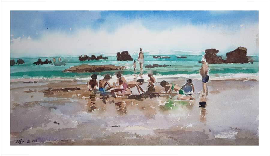 Cuadro en acuarela de uno niños jugando en la playa de Noja, Cantabria.