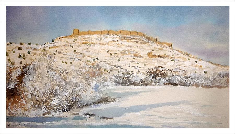 Pintar este tipo de temas dejando el blanco del papel y a la vez con gouaché de color blanco siempre es un reto y a veces complejo debido a que hay que trabajar siempre sobre la sombra para sacar las partes más claras pero el resultado de los cuadros de paisajes nevados siempre es muy atractivo sobre todo cuando se tiene delante un paisaje tan espectacular como lo es este del castillo de Gormáz.