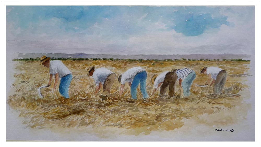 Acuarela de unos segadores realizada por el pintor Rubén de Luis