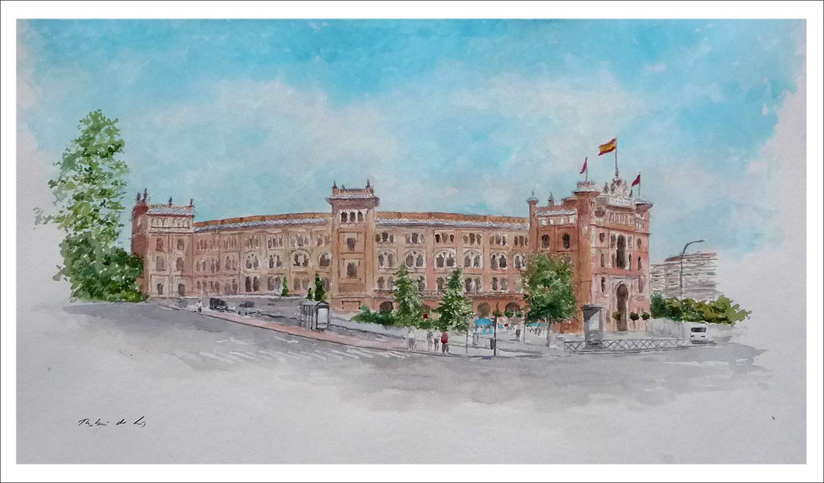 Esta acuarela de la Plaza de Toros de las Ventas en su fachada principal, recoge una escena de la que es considerada la plaza de toros más importante de todo el mundo. Una vista con todo detalle desde el exterior y uno de los laterales desde donde se puede ver un conjunto bonito del este edificio neomudéjar.