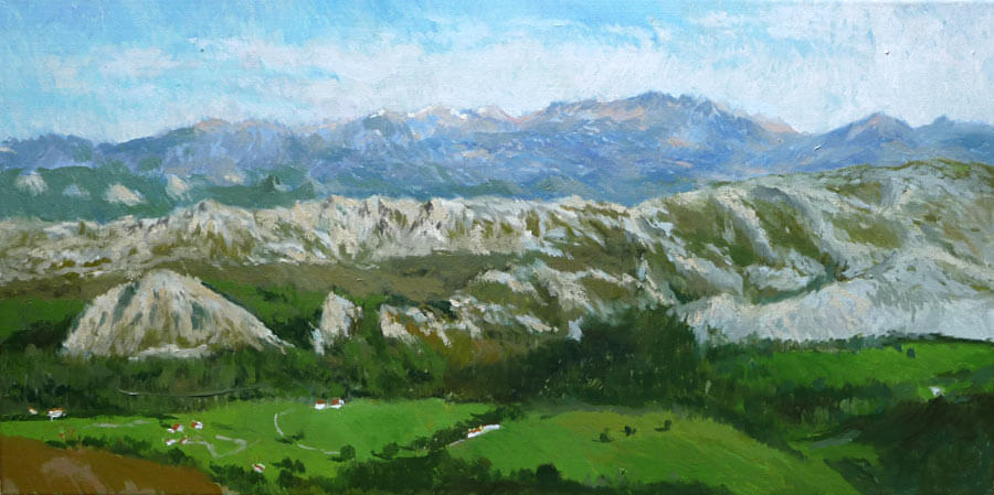 En este cuadro al óleo se puede contemplar los picos al fondo con un ligero tono rosáceo en sus cumbres y el resto de tonos azulados debido a la lejanía y en la zona de los prados verdes se puede ver el pequeño pueblo de Linares.