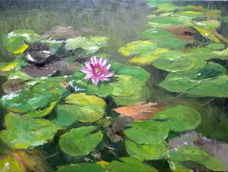 No puedo ocultar con este cuadro la influencia que la pintura de Claude Monet ha tenido en mi pintura y que me parece de una frescuara y calidad impresionantes. Monet pasó los últimos años de su vida en Giverny y mandó diseñar un jardín en el que cambiaba a menudo dada la experiencia de jardinería que tenía el artista. Él mismo dijo:» Me hizo falta algo de tiempo para entender a mis nenúfares (…) Los había plantado por puro placer; cuando los escogí, no pensé en pintarlos. Uno no se siente conmovido por un paisaje de la noche a la mañana. Pero, de repente, descubrí cuán hermoso era mi estanque y eché mano a la paleta».