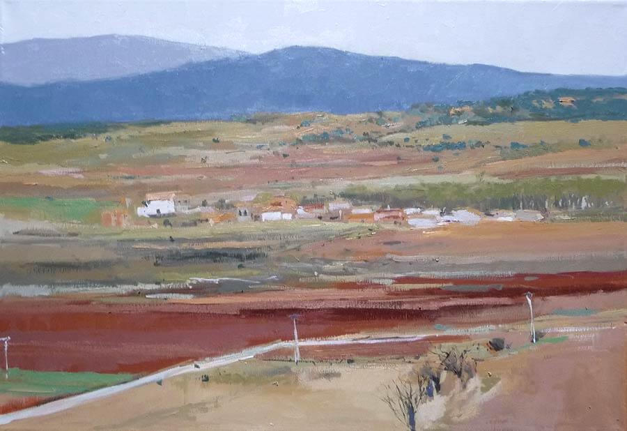 Este paisaje en colores teja y tonos rojizos representa un paisaje castellano que bien podría ser de las tierras altas de Soria entre la montaña y el llano donde pequeños pueblos aún sobreviven al aislamiento de la administración.Son paisajes que poseen un encanto particular que están llenos de tonalidades y de matices salpicado por pequeños pueblos. En una especie de colores ocres y colores rojo teja se dispone este paisaje como di de un tapiz de color se tratara con las diferentes lindes de cada terreno y las casas salpicando este paisaje tan característico de esta zona de Castilla y León. La zona más contrastada es la franja de color rojo más oscuro de la zona inferior y a medida que levantamos la vista el color del paisaje se aclara apareciendo verdes y ya en la zona de las montañas de colo azulado debido a la distancia la más próxima de colores más oscuros y la mas alejada de tonos más claros hasta el cielo donde se aclara todo mucho más y hace que el contraste con el paisaje sea total. Luego está el camino casi siempre presente en todos mis cuadros. Un camino que aparece desde el margen izquierdo y se va elevando hacia arriba y gira a la derecha con los postes de teléfono marcando su recorrido y algún árbol. Para finalizar el comentario sobre este cuadro podemos ver el pequeño pueblo en mitad del cuadro con sus fachadas blancas y sus tejados de color naranja claro. Nada más ver el cuadro la vista se nos va hacia este punto a pesar de los fuertes colores que hay en el paisaje.