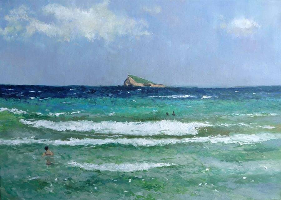 Este óleo con un fuerte sabor mediterráneo tiene como protagonista a la pequeña isla que se encuentra frente a Benidorm.