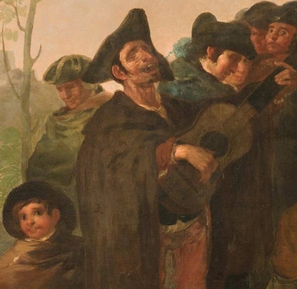 Por otro lado con un mensaje a modo de moraleja del que poder sacar algo en claro. Junto al ciego se haya la figura de un niño que nos mira sonriente, cómplice de nosotros que también sonreímos al mirar la escena que tenemos delante. Esta sonrisa nos indica quizás lo mal que canta el ciego.