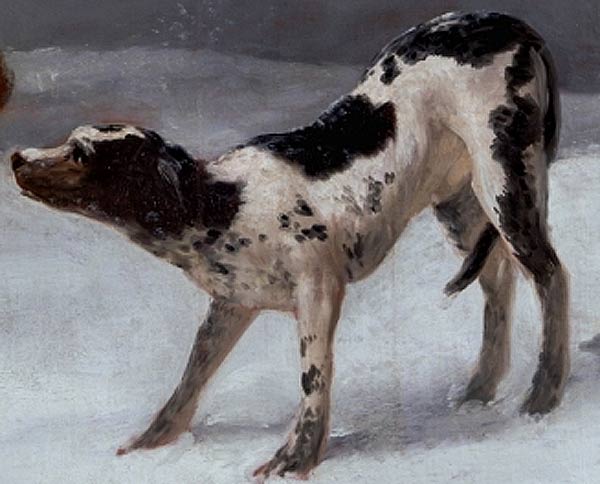 Otro tema y esta vez es un perro el que capta nuestra atención. No es la primera vez que Goya añade animales a las composiciones de sus cuadros, ya que los utiliza muchas veces para mostrar la naturaleza y comportamiento del ser humano. En esta obra aparece este perrito en la zona inferior central del cuadro.