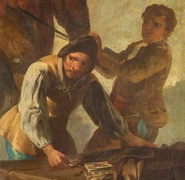 Sin embargo, este personaje nos cuenta el motivo por el cual hay una pelea en la escena que contemplamos. Es el posadero que con cara de preocupación y desconfianza a la vez que de temor se apresura a recoger las monedas que hay en la mesa.