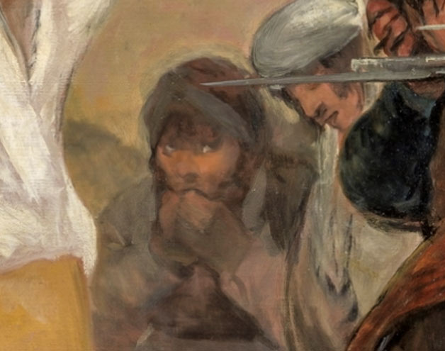 Si observamos su rostro compungido, mordiéndose las manos, tembloroso y encorvado, vemos como se aprecia el arrepentimiento de haber estado en el momento equivocado ya que lo han apresado y será el próximo en ser fusilado.