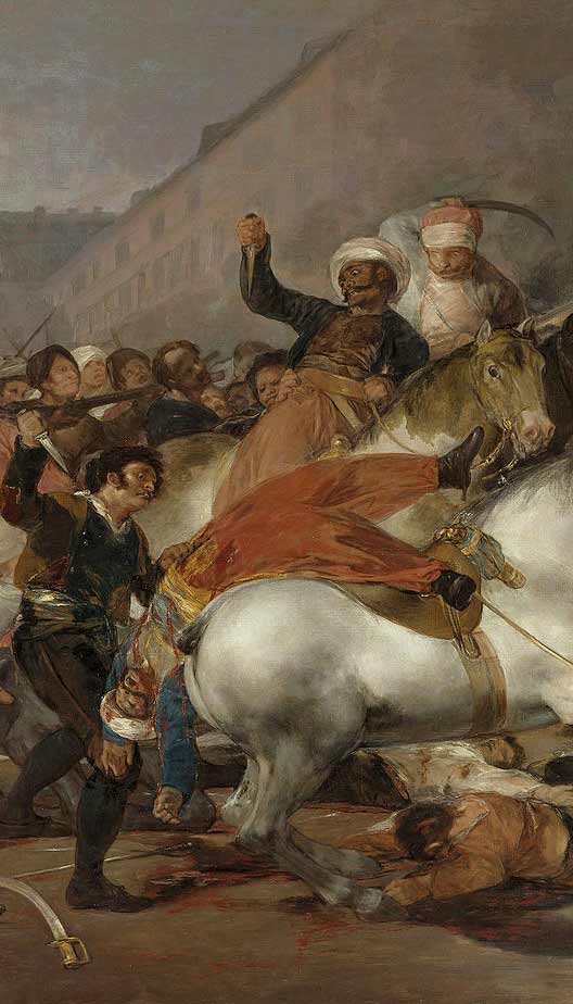 En el siguiente fragmento perteneciente a la obra «La carga de los mamelucos», los madrileños acuden con sus armas a apuñalar a los soldados que con gestos de pánico ven como su final está cerca.