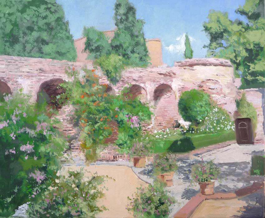 Este cuadro al oleo corresponde a un rincón de la Alcazaba de Málaga un lugar que se pueden encontrar bonitos rincones y que me han llamado la atención para pintar en este cuadro de mediano formato en el que se puede apreciar una serie de arcos de ladrillo rodeado de vegetación como solían construirse este tipo de estancias palaciegas tales como la Alhambra de Granada o la Alcazaba de Almería en donde todo gira entorno al agua y la vegetación a parte de servir como lugares defensivos.