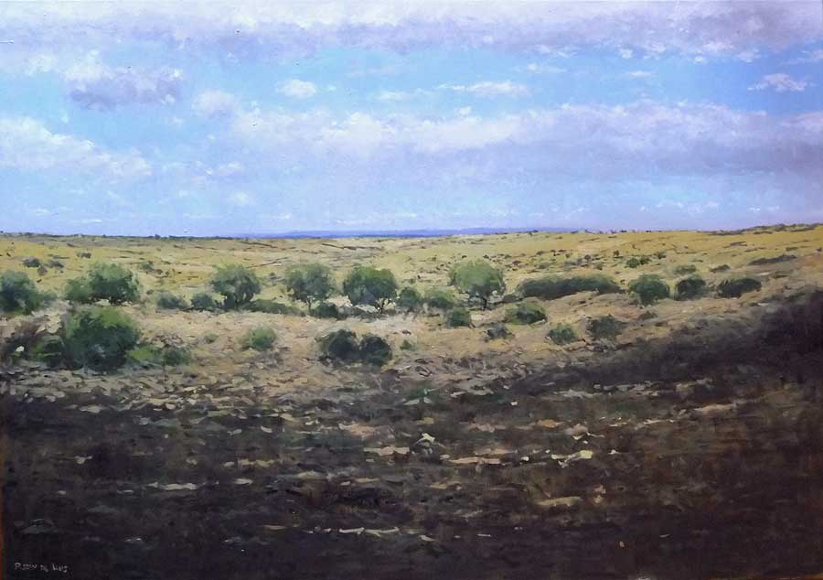 Este paisaje al óleo es de la provincia de Toledo en las cercanías de Madrid.Se trata de un paisaje de tonos ocre y tierra destacando un cielo con una diminuta pincelada muy trabajada para conseguir profundidad horizontal al igual que la parte inferior de la tierra.