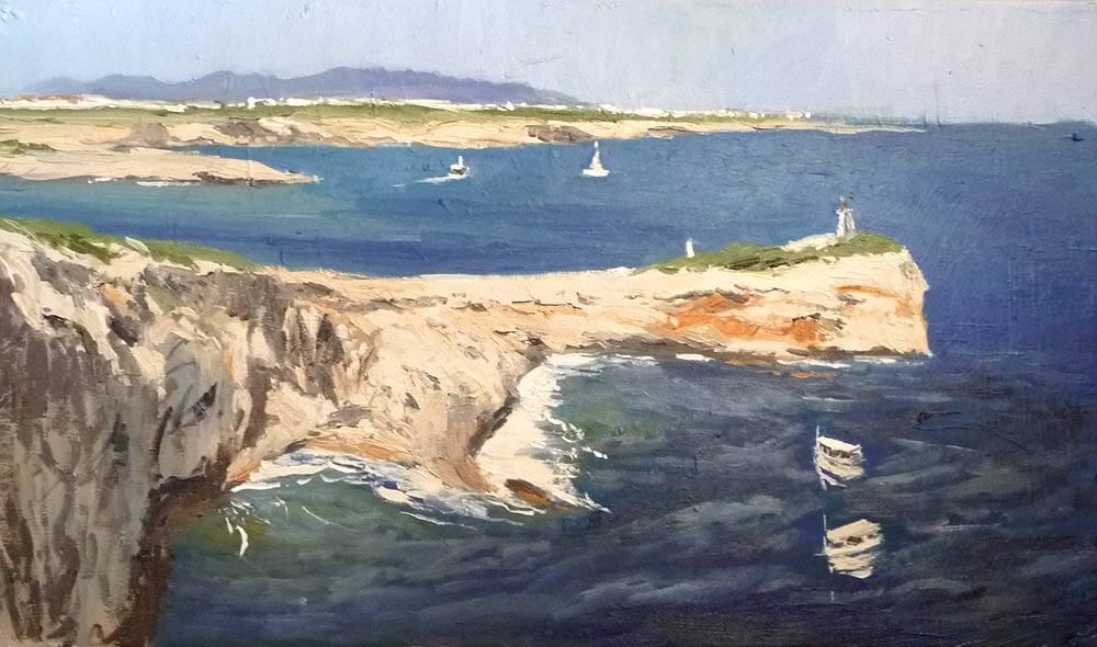 Un cuadro al oleo de un formato algo panorámico de una vista de este lugar tan conocido en Mallorca que quise pintar con una luz que ilumina la zona de rocas en la que se aprecia a un par de embarcaciones fondeando alrededor sobre un mar de un azul intenso. El color del cielo de un azul claro contrasta con el del mar a la vez que el perfil de la costa de un color ocre claro pone la nota de luz en este cuadro que pinté hace un tiempo con una pincelada larga con bastante pasta y carga de pintura y que aún no se había transformado en un tipo de pintura Impresionista más cercana a la que hago ahora mismo. Como en otras ocasiones se trata de un cuadro realizado de modo rápido y utilizado como estudio de color y del paisaje para realizar otro cuadro de mayor tamaño. Mallorca posee multitud de paisajes que encontramos a medida que recorremos la isla y que son realmente atractivos para pintar. A lo largo de los siglos multitud de artistas se han acercado a la isla para retratar sus calas, el interior o las zonas de más difícil acceso de acantilados y como artista es complicado resistirse y no pintar sus paisajes.