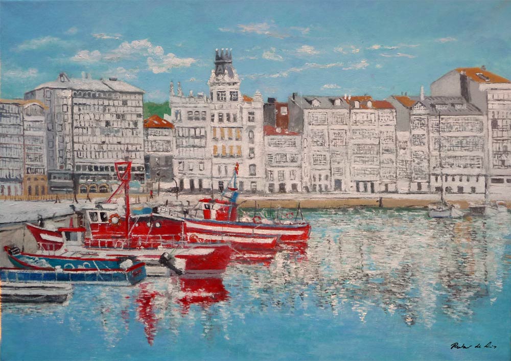 En este caso el famoso paseo en la dársena del puerto de La Coruña. Algunos edificios con terradas cerradas de color blanco y de finales del siglo XIX y comienzos del XX se aprecian en hilera junto al muelle.