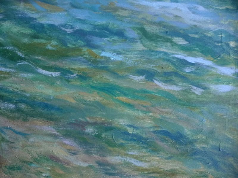 Cada pincelada contiene con bastante carga de pintura con diferentes zonas de empaste luminosas. También he añadido empastes en distintas zonas del mar sobre todo con trazos redondeados en algunas zonas y de un modo horizontal en la zona del agua.