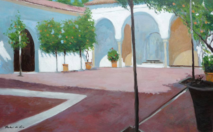 Iluminado el patio parcialmente, las sombras hacen juegos de siluetas dentro de sus arcos con semicírculos de diferentes tonalidades. Los naranjos ornamentales decoran este lugar y también aportan colorido y contraste al conjunto a la vez que la fachada de blanco resalta mas por su luz. El pavimento del patio queda en semisombra lo que hace que destaque también aún más.