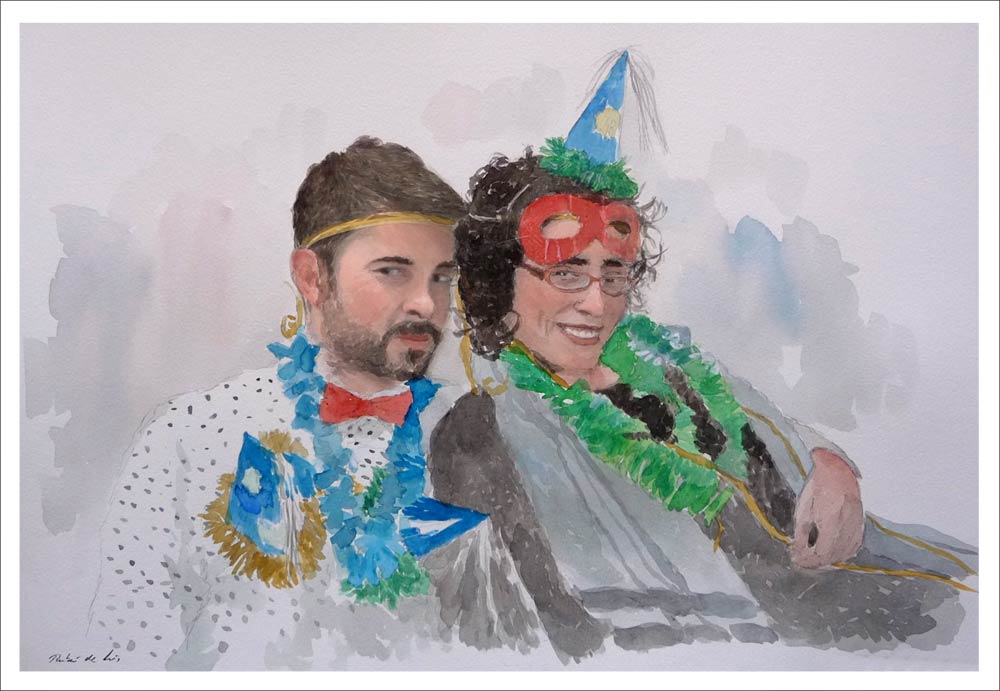 Retrato en acuarela de una pareja en Nochevieja
