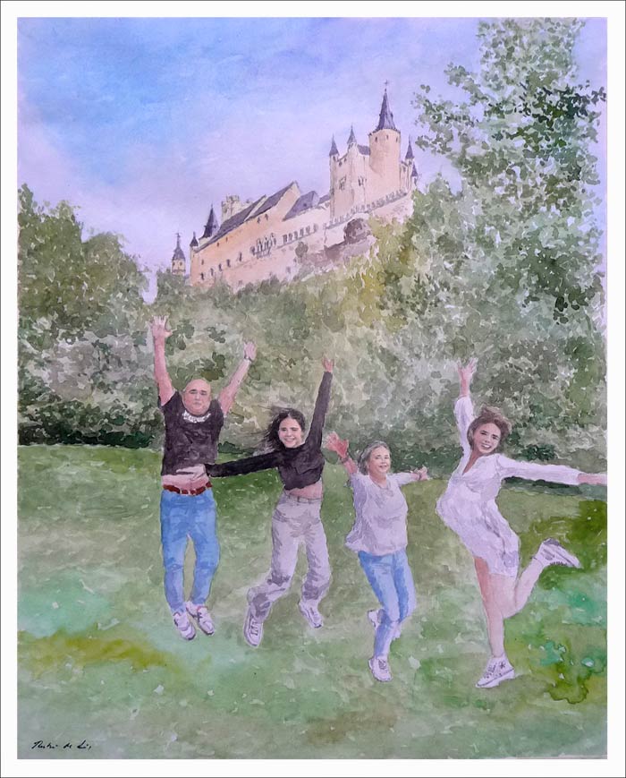 Y también de recuerdos de momentos especiales o que tienen especial significado para las personas. Como lo es el de esta familia que se muestran alegres saltando sobre la hierba junto al Alcázar de Segovia como se puede observar al fondo.