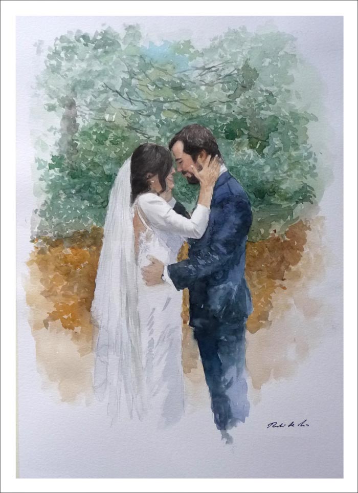 Retrato en en acuarela de unos novios en el jardín