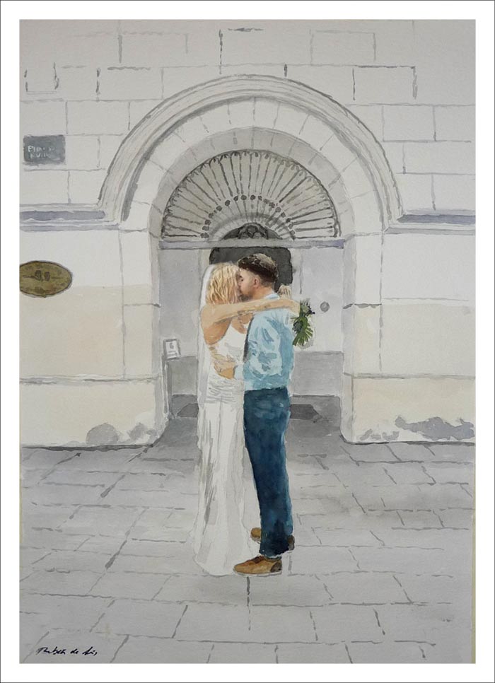 Un recuerdo que alguien cercano a ellos me pidió pintar para que pudieran conservar este recuerdo del día de su boda. Toda la escena es muy luminosa dado que el fondo del edificio ante el que posan también es de colores grises muy claros.