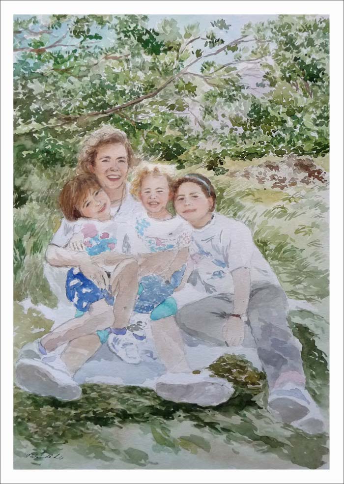 Se trata de una acuarela familiar que me han solicitado pintar a partir de una fotografía que recibí. Una acuarela en la que se aprecia a un grupo familiar entre la naturaleza posando de manera espontánea.