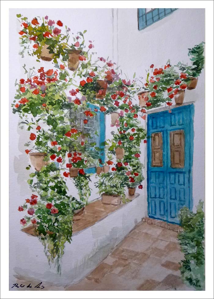 La luz de Córdoba en esta acuarela de un rincón de un patio cordobés pintada en un formato pequeño. Con muchos detalles en las flores, los geranios y las gitanillas que cuelgan desde sus macetas.